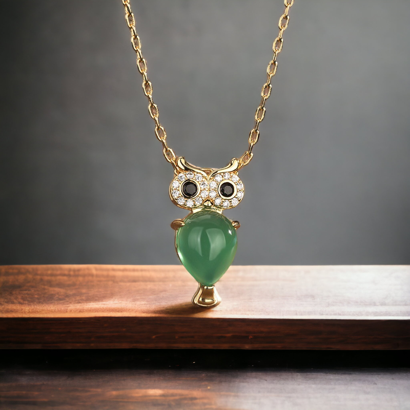 Vintage Design Chrysoprase Owl Necklace with Rhinestone, 24k Gold Plated Vintage Style Necklace